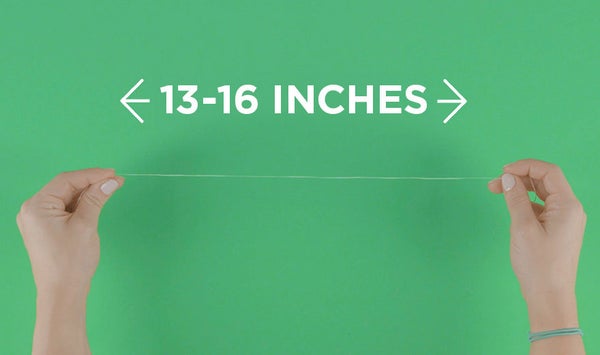 First, grab 13-16 inches of floss. Hold the floss & wrap it around each middle finger, keeping a short section taut between your thumbs and index fingers.